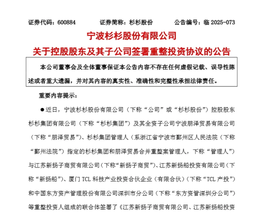 9月30日晚间,宁波杉杉股份有限公司(下称“杉杉股份”,600884.SH)公告披露,公司控股股东杉杉集团有限公司(下称“杉杉集团”)及其全资子公司宁波朋泽贸易有限公司、杉杉集团管理人(系浙江省宁波市鄞州区人民法院指定的杉杉集团和朋泽贸易合并重整案管理人,下称“管理人”)与江苏新扬子商贸有限公司、江苏新扬船投资有限公司、厦门TCL科技产业投资合伙企业(有限合伙)和中国东方资产管理股份有限公司深圳市分公司等重整投资人组成的联合体签署了《重整投资协议》)。