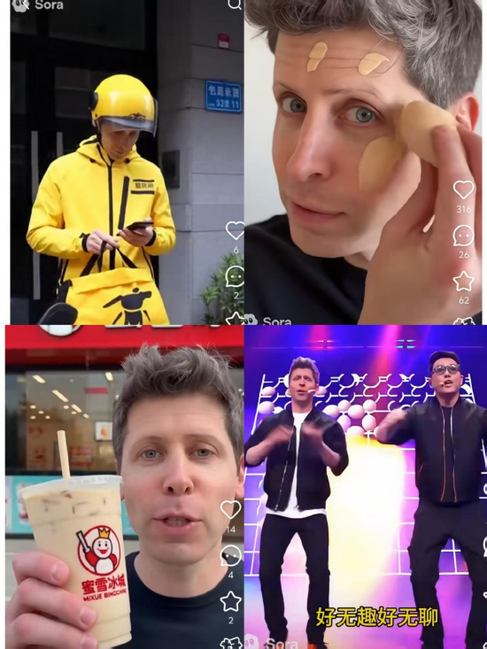 此外,随着Sora的“客串”(Cameo)功能上线,OpenAI首席执行官奥特曼也成为了这两天互联网最忙的人。在网友们的创意驱动下,他或在厕所高歌,或在金字塔前热舞,或现身制作预制菜,甚至能为蜜雪冰城代言。这些逼真到真假难辨的短视频在网络上病毒式刷屏,被网友们直呼“玩坏了”。